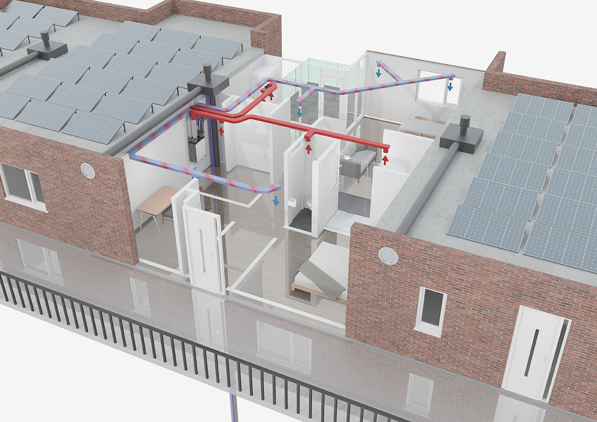 De unit voert continu vervuilde en vochtige lucht af uit de woning en brengt tegelijkertijd verse buitenlucht naar binnen. Via de efficiënte warmtewisselaar wordt de warmte uit de afgevoerde lucht overgedragen aan de toegevoerde lucht, waardoor warmteverlies tot een minimum wordt beperkt en het energieverbruik laag blijft. Dit zorgt voor een aangenaam binnenklimaat in elk seizoen.