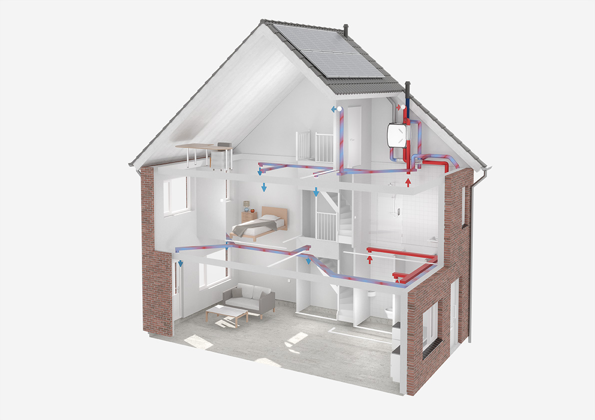 De unit voert continu vervuilde en vochtige lucht af uit de woning en voorziet tegelijkertijd in een constante toevoer van verse buitenlucht. Dankzij de efficiënte warmtewisselaar wordt de warmte uit de afgevoerde lucht optimaal overgedragen aan de binnenkomende lucht. Hierdoor blijven warmteverliezen beperkt en blijft het energieverbruik laag, wat bijdraagt aan een comfortabel binnenklimaat gedurende het hele jaar.